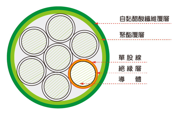 :高頻利茲線包覆天然絲、滌綸絲或尼龍絲能增加機械性能並獲得優異的尺寸穩定性。對機械應力的額外保護、柔韌性高、無需接續。