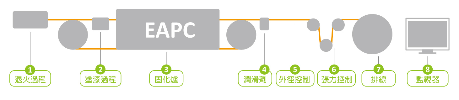 所有的單股漆包線都是在特製的塗漆機上生產的,塗漆是一個連續的過程,主要由退火、絕緣漆塗覆、固化、潤滑劑塗覆、張力控制和排線這幾個工序組成。